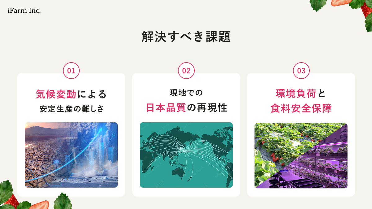 日本のいちごは世界的に高級品(1kgあたり1〜3万円)ですが、輸送コスト・鮮度・気候等の課題により、“現地で日本品質を再現し届ける” ことは困難でした。