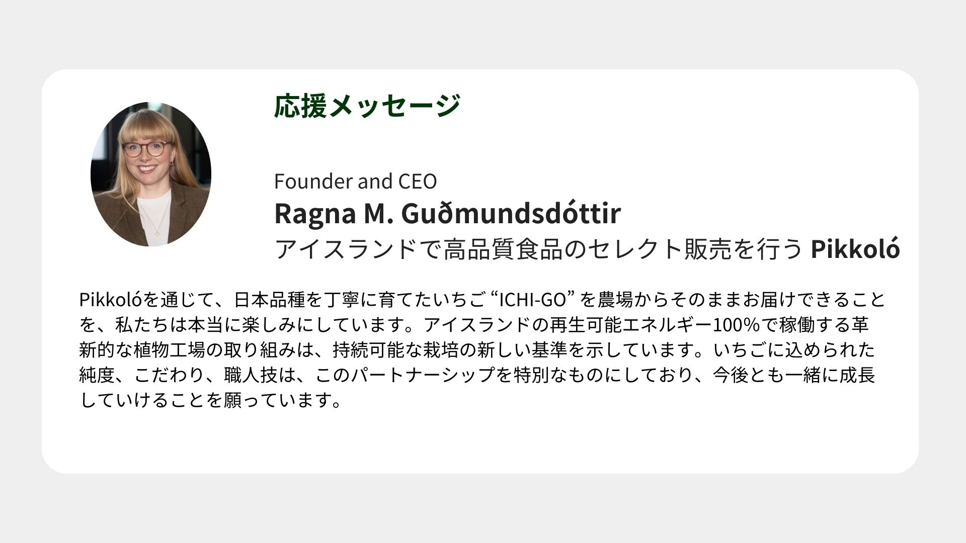 「日本の繊細な味わい」と「アイスランドが象徴するクリーンエネルギー環境」を融合させ、「日本品質 × アイスランド産」という新しいプレミアムブランドを育てていきます。それは、味覚の豊かさと環境意識の高さを両立した、「サスティナブルなプレミアムフード」です。