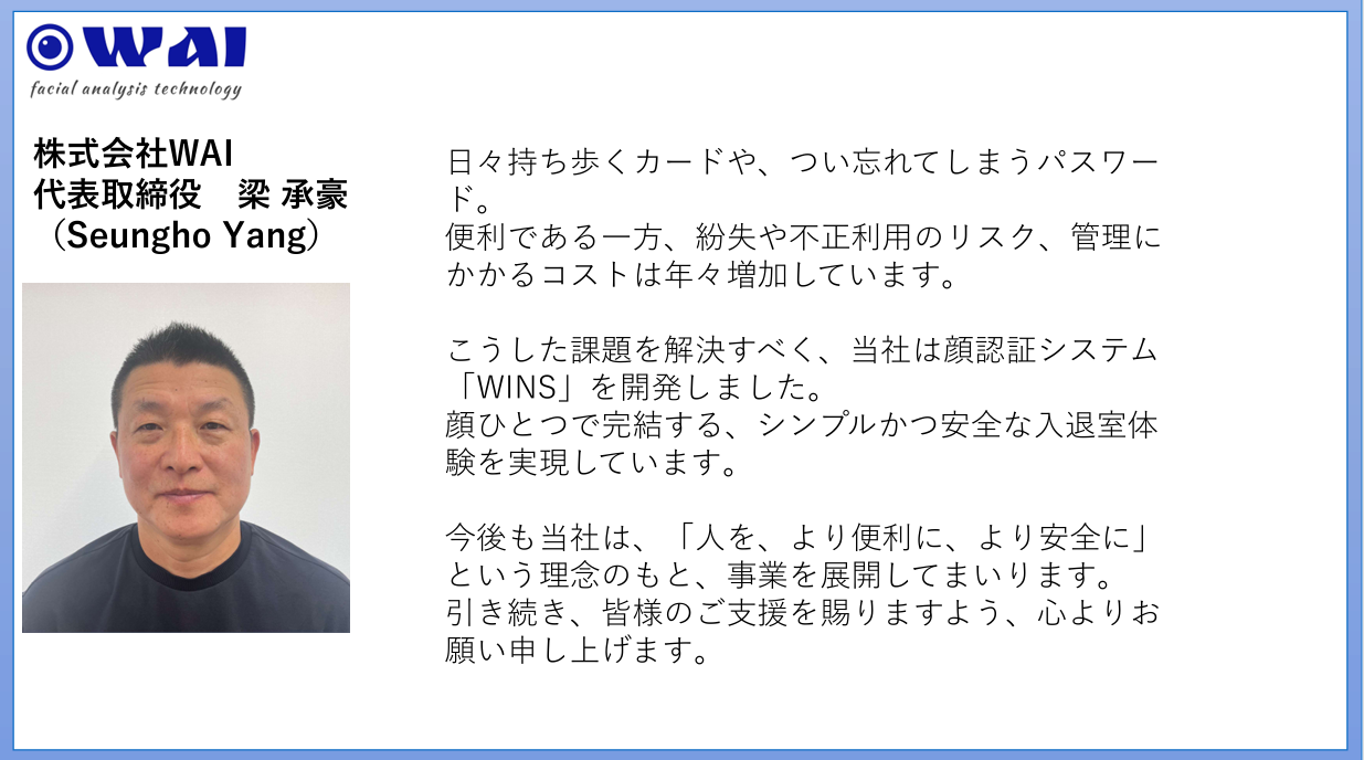 WAI社の「WINS」は、汎用CPUで動作する軽量なAI基盤顔認証システム。導入コストは従来の約1/3。